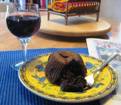 Mocha cake from NY CakesI’d met sons Bill J. (the apprentice pastry chef) and Tyler on opening day.  Yesterday daughter Amanda was presiding over the glass case.  She introduced me to the chocolate mocha lava cakes.  “Just put one in the microwave for 30 seconds.  The inside liquifies and makes a sauce . . . ”  Sold.