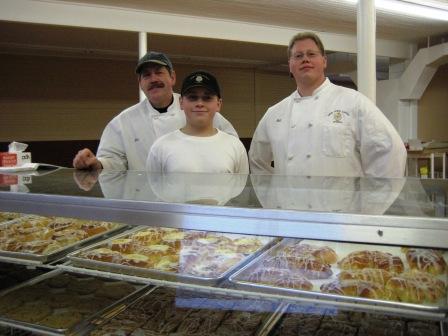 Bill and Tyler and Bill J. at NY CakesEarly in February Eastport residents Bill and Dianne Warner opened a pastry shop in a former grocery store in Atwood, and quickly built a loyal following.  (I, for example, would follow them anywhere for a peach and cream cheese bear claw.)  This in itself is remarkable enough in these times, but wait – there’s more.  Their children work there – and they like it!