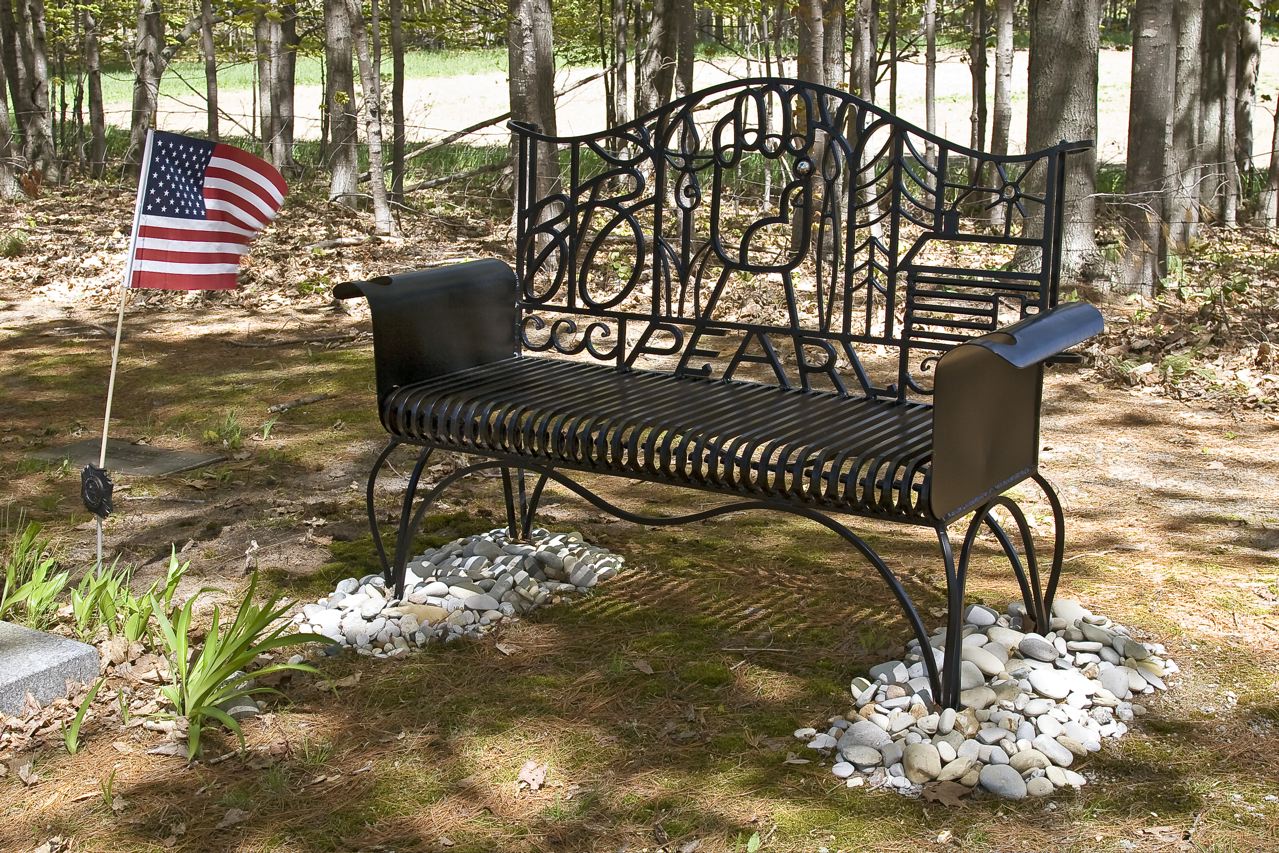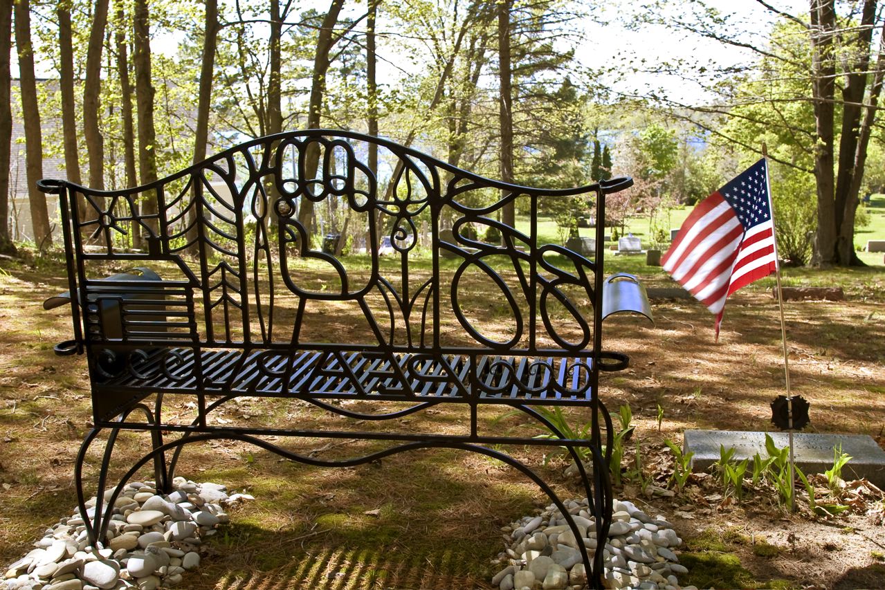 Everyone who knows her – or who read about Betty Beeby on the occasion of her 85th birthday – knows about the bench she commissioned for the Pearl family section in Lakeview Cemetery. Blacksmith Art Brown translated Betty’s design into wrought iron at his studio at Torch Tip Ironworks. In April I dropped by to see the work in progress, and found Art pondering the best material to use for the pearl. He figured it out and installed the finished piece at Lakeview, where you can see it for yourself – or you can just enjoy the pictures Babs Young took for you. (Click on the photo to see a larger view.)