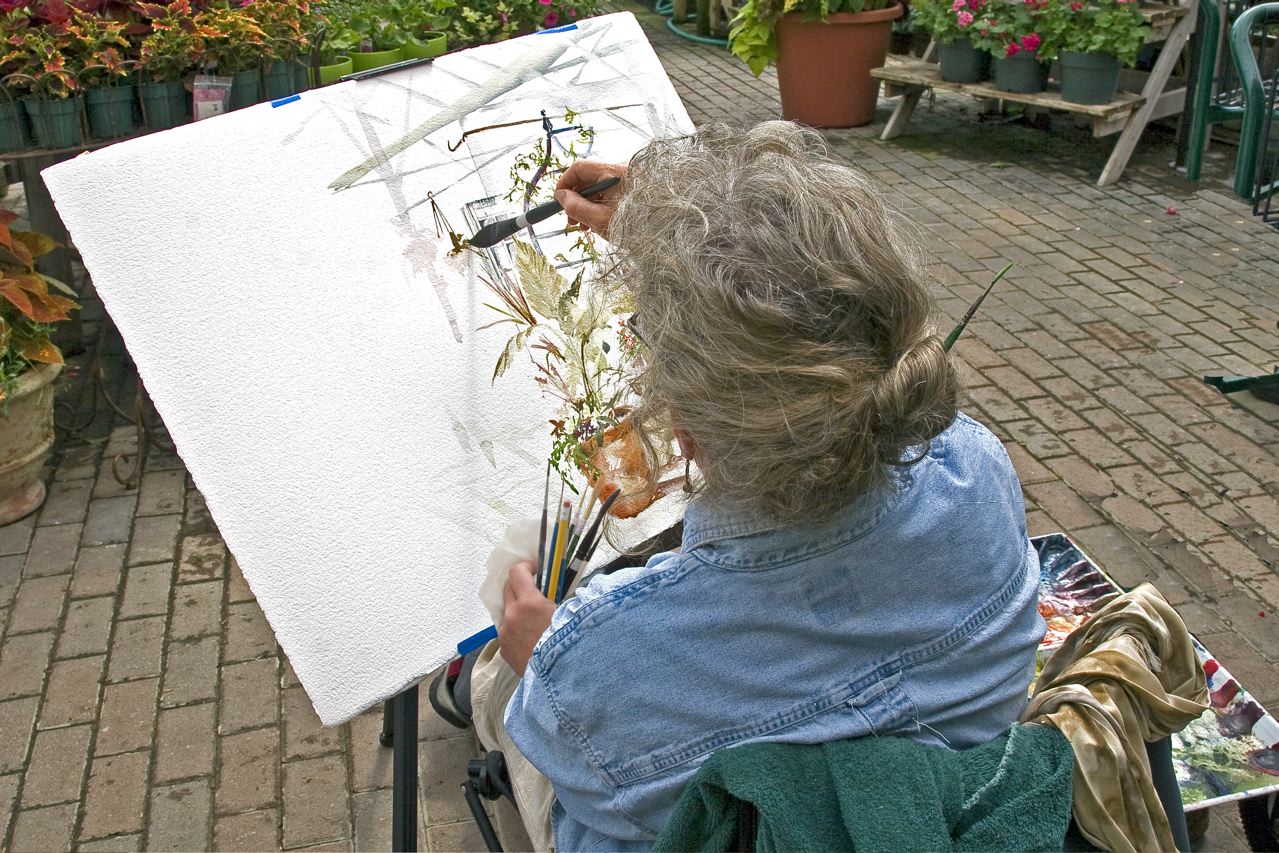 The Jordan River Arts Council sponsors a weekly Artists Gathering at different locations for local artists to work. This week we met at Pine Hill Nursery. Below Pat Tinney, East Jordan High School art teacher, is doing a watercolor inside one of the green houses.