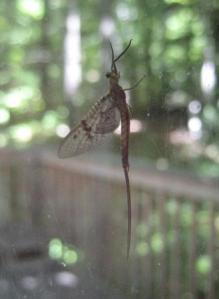 This mayfly landed on the front door on the last day of June and was still there the next day. Since she’s much more attractive than the junebugs that are all over the place, I thought I’d post her as the emblem of the invasion. Ever since it stopped snowing (sometime in mid-June as I recall) we’ve had an influx of insect life. Insects, bugs, spiders, flies – thank heavens most of ’em don’t bite. Anyway, I just thought I’d alert the birds who’ve migrated up here for the summer (fudgie birds) that over here in Torch Lake Township we are well supplied with tasty treats and amazing Insect Biomass. They should all come over and feast.