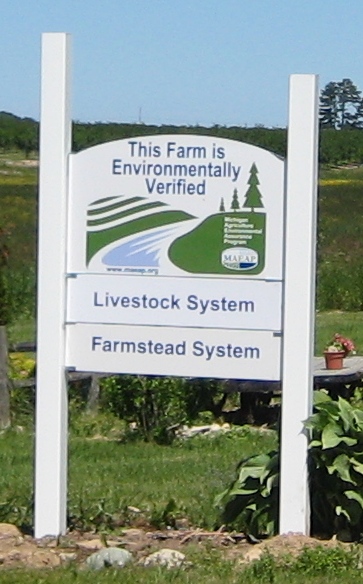 The shiny new sign was conferred by the Michigan Agriculture Environmental Assurance Program (MAEAP), a partnership between farmers, conservation groups and the Michigan Department of Agriculture. It verifies that a producer’s environmental practices meet or exceed all regulatory standards, that a comprehensive plan is in place to identify and prevent agricultural pollution risks, and that all this is verified by third party inspections.