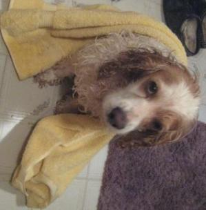 I persisted. Skunked dog is not a nice aroma. A new potion was brewed, this time in a larger container, with the lemon juice added last. It still bubbled up convincingly, but this time it stayed in the cauldron – er, pyrex bowl. Plop the Cowboy in the tub. Work quantities of potion through his fur. Wait a bit. Sniff. Rinse. Repeat. Most of the day was occupied with potion brewing and application. The deck rail is festooned with drying towels and dogwashing clothes. The Cowboy still smells of skunk, with a nice overlay of lemon. He is bearable. My son says that, as with so much in life, the only real cure is time. He is probably right.