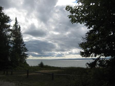 This morning clouds piled over the bay, and tall trees tossed in the wind, all silver and slate.