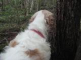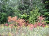 Signs of summer fading are everywhere. The cedars are covered with their rosebud cones. The grasses are pale, and the first bright leaves glow against the deep green of the pines. The pileated woodpeckers have been busy on a dying birch tree. No mosquitoes now. It’s a perfect time to explore the wetland woods. Miss Sadie is on the alert at once. She has that serious terrier look, and the muscles in her jaw are bunched. The Cowboy, on the other hand, is peering out from behind a tree. But do not be misled. At the first sign of danger Miss Sadie will be off, dragging us behind her, while the fluffy Cowboy keeps up a fierce rearguard action. You do not want to underestimate the Cowboy. (Yes, as always, click on the tiny images for larger versions of the photos.)
