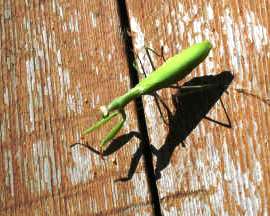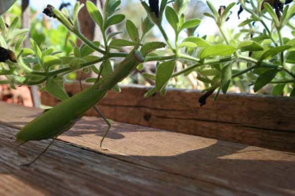 I’m pretty sure Katy’s beautiful creature is a praying mantis, one of the bugs the Michigan Department of Agriculture calls a “Good Bug.” The MDA says, “The praying mantis is a beneficial bug because it has a healthy appetite for bugs that damage crops . . . . It is a fierce hunter, and can eat much more than it weighs each day. Using its two front legs, the mantis will attack bees, beetles, spiders and even mice, lizards and small birds. They bite the back of their victims’ necks to paralyze them. Mantis nymphs, or young mantises, eat leafhoppers, aphids and small flies.” Between attack flies and fierce praying mantises, Katy’s farming operation sounds a lot more adventurous than you might have guessed, eh? Here’s another view of her visitor: