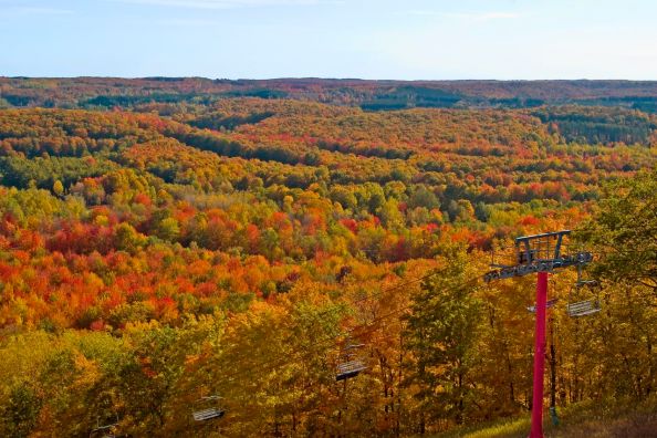 Miss Sadie, the Cowboy and I drove home today from a visit downstate, and I kept wishing I could figure out a way to get a really good view of all the wonderful fall color. Well. Babs figured it out. She says, “Schuss Mountain offered a ride up the big chair lift yesterday for three bucks. I think it was worth the money and time.” Well I guess so.