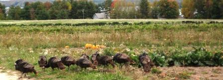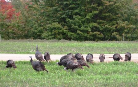 Once upon a time wild turkeys had practically disappeared from northern Michigan. After a lot of effort by the DNR and conservation groups, they’re plentiful again.  A hunter has some property just up the road where he parks a travel trailer during turkey season.  He is locally famous for spending an entire day, pre-dawn to post-dusk, out in the woods looking for birds and finding none.  When he returned to the trailer tired, hungry and birdless, he found the entire area covered in turkey tracks and, um, other evidence of their little holiday at his expense.  Turkeys have been known to pop out from under my deck (and no I do NOT know what they were doing in there). The other day I was picking up my CSA share at Providence Farm and saw these: