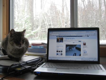 And here’s Miss Puss staying close to the warm air vent on the laptop while the “lake effect” tumbles out of the sky.