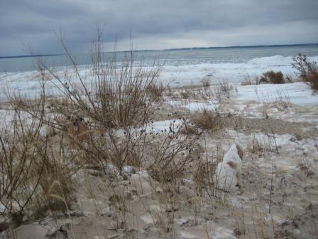 The Disreputable Duo blend easily into the sand and snow streaked beach landscape of early winter. Can you see them?