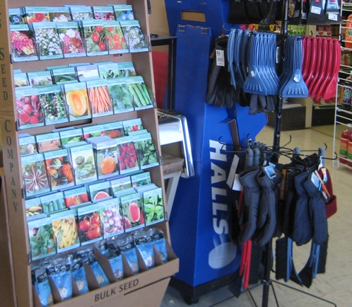 It was warmer inside, where displays compete for attention near the entrance. Flower and vegetable seeds next to insulated gloves and ice scrapers. Must be spring in Michigan.