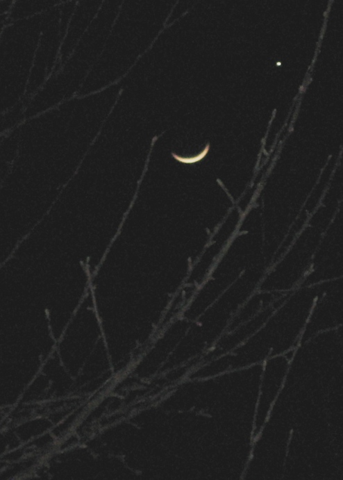 “Gerry, come look at this!” OK. I trailed after Angie, out the back door of the IGA. Hanging up there in the sky was a perfect new moon pointing at Venus.