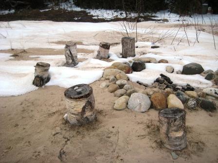 Birchbark. Here’s a fire ring on the beach surrounded by seats made of birch logs.