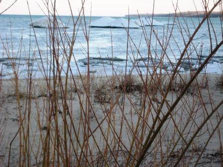 People who are not here but either (A) wish they were or (B) want to have confirmed for them that Florida is a better place to be in April, ask for updates on the ice on Torch Lake and the Bay. Miss Sadie, the Cowboy and I had a lovely walk on the beach early this morning, and are pleased to report the following: