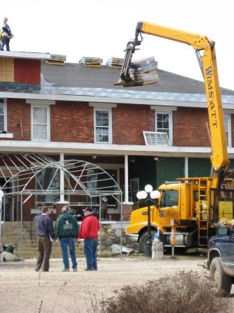 Progress continues at the Blue Pelican. On Tuesday a big yellow crane was lifting pallets of shingles up to the roof.