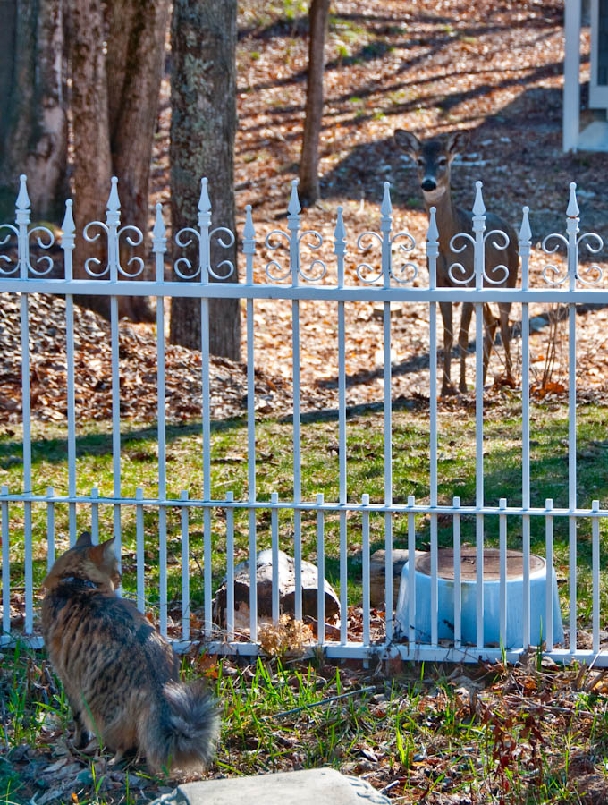 Bruce Laidlaw, a/k/a the Weatherman, is painting the fence today. He writes: Tiger is a big strong cat who is only allowed outside on a leash. Even in the fenced garden he must be supervised because fences only slow him down slightly. On Friday morning, he was poking around in the garden when a deer was strolling by. She stopped and opened her eyes wide when she saw the Tiger in the garden. The standoff lasted ten minutes while she stomped to try to impress Tiger. He wasn’t fazed. Finally, he decided to get a closer look and climbed up on the fence. The standoff ended when I went out to prevent the escape.
