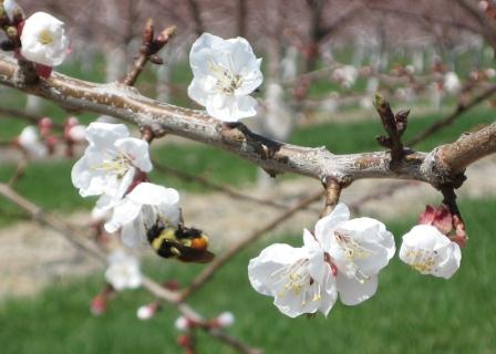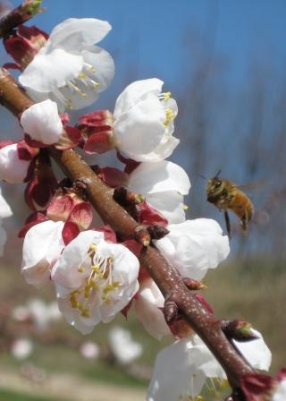 Jim King said I could wander around in the orchard behind his house, where there are boxes of Dan DeKorne’s bees and rows and rows of trees flowing over the ridges. It’s early days yet, but I found bee boxes buzzing, lush spring grass, and one apricot tree that had ventured into bloom. It was exceedingly popular on a warmish afternoon.