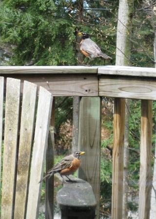 Mr. and Mrs. Robin checked out the neighborhood before they moved in.  They perched on the deck and watched me working at my desk.  Surely they noticed the resident cat and the resident dogs, but they must have decided that the chosen location was relatively secure, which is possibly the best a robin can hope for.