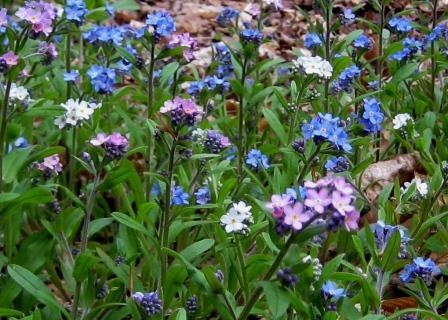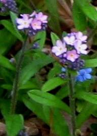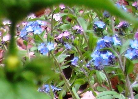 It is useful to have younger sisters. That way when your memory goes to blazes you have someone to help you keep track. My sister Cheri in particular has a sturdy filing cabinet in her capacious mind, and is often referred to as The Family Archive. She lives in North Carolina, so it is inconvenient for us to drop by each other’s houses to have dinner or go to a movie. Instead, we have been known to yattety-yat on the phone while making our dinners and then eat them “together” in proper virtual fashion. This is what we were up to the other day when I glanced over the deck rail and saw a patch of forget-me-nots. “Cheri!” I said. “I’m going to take a picture of the forget-me-nots and put it on the blog for you!”