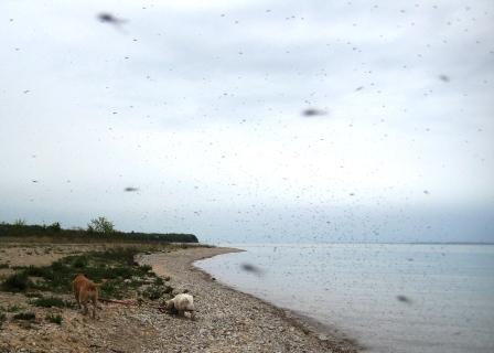 I tell you, there is no end to the misadventures that are possible. We are in the midst of the annual Flight of the Miserable Little Black Helicopters. I do not know what they are, but I’d be glad to have a name to pin to them, so that I could curse them by it. They don’t bite, but they do fly about in great clouds, getting into nostrils and eyes and hair and generally making a nuisance of themselves, especially down on the beach. The other day they they made life miserable for Miss Sadie, the Cowboy and me while we were at the Torch Bay Nature Preserve.  Looky here.  Not dust on the lens—a battalion of bugs.