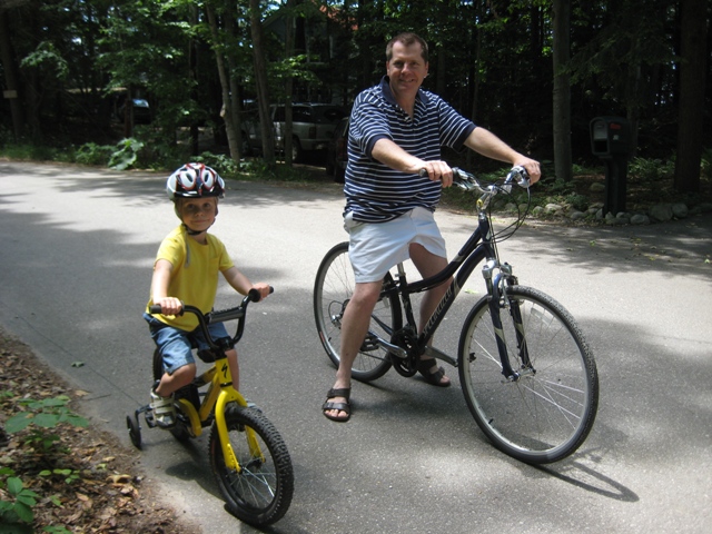 As I was walking through the neighborhood with Miss Sadie and the Cowboy I met Tommy and his dad, Ken, going for a little Fathers Day bike ride. The Disreputable Duo were ecstatic. They like Tommy a lot. Much petting and leash tangling ensued, but nobody fell over. I figure the day will be a happy memory for Tommy, and maybe a long, long time from now he’ll look at a copy of this picture and remember how it was back in the olden days, when his Dad was a young guy, and Tommy himself was one cute little kid on a yellow bike.