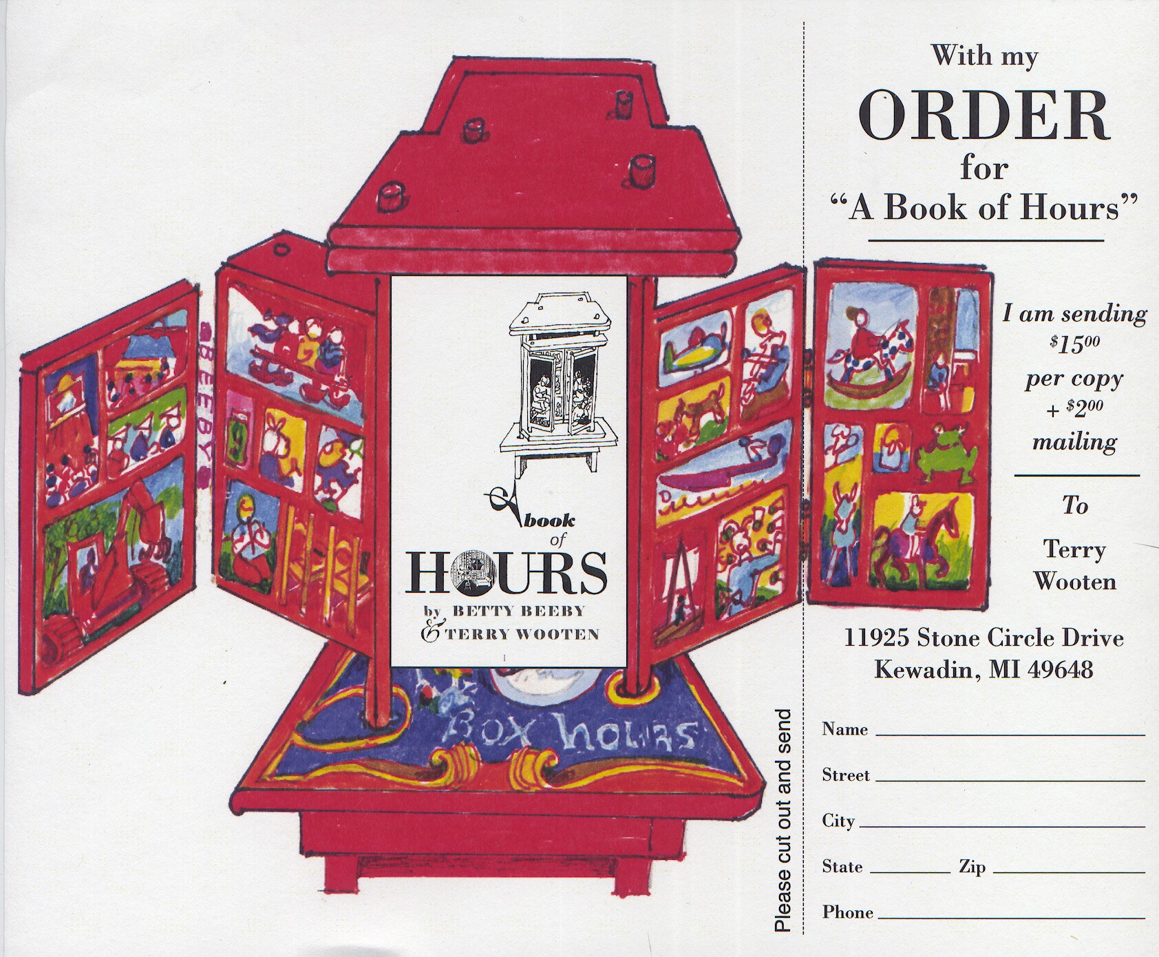 And now a word about the future. If printer Jack Bodis can do without sleep for the next week or so, copies of A Book of Hours, by Terry Wooten and Betty Beeby, should be rolling off the presses and trundling up the path to a bookstore, gift shop or Bait Shop near you. Reserve your copy now. No telling how long Jack can keep up the pace.
