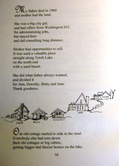 Who would imagine that such a gracious woman could, in her flaming youth, have driven smack into the little log cabin that still stands–well, leans, really–on that big curve in M-88 just south of the King Orchards farm market? But Gary Dawson told me the story, and Gary Dawson is widely recognized as a fair and accurate historian of local matters. Betty says he’s got it all wrong, she only ran into the totem pole in front of the old Shady Nook, not the cabin itself, and besides, she wasn’t driving recklessly, she had merely, um, omitted to establish the whereabouts of the brakes before taking over the driving chores from her sister Ann, and in any case Jeanne Sage, the owner of the totem pole in question, forgave her and kept her on at Shady even though she–Betty that is–was not all that good at math. You know this curve. You can see how it could happen. I wonder whatever happened to the totem pole.