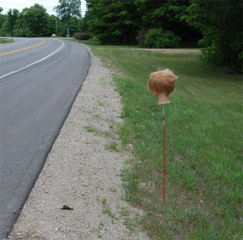 We have a leg kicking up in the air above someone’s mailbox. Truly. People put shoes and garter belts and other oddities on it. Your head seems along the same lines.