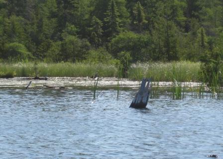 At its mouth the Torch River opens into a flooding that’s been there since the Elk River was dammed in the 19th century. The area is full of stumps and drowned logs and little coves, including this one, where Thom said he thought the not-phragmites might be wild rice.