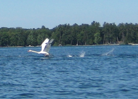 We moved out into Lake Skegemog and headed to the Fairmount Drive takeout. Half a dozen swans were congregated near a point. They conferred and decided to give us an air show. Swans in flight make an enormous racket with those huge wings. It was pretty impressive. By now Laura and Derek had rejoined us. They reported that they hadn’t spotted any phragmites in the Rapid River bayou, so this was a good news day all the way around.