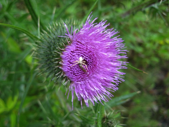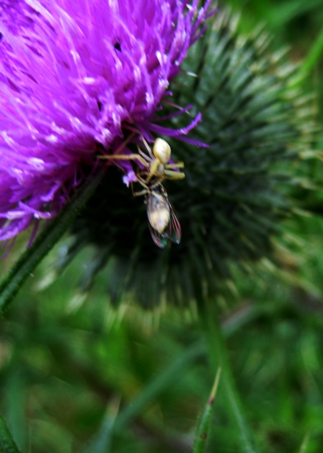 As I waded through wet bull thistles taking pictures, I discovered a little drama at the heart of the flower, and decided that had metaphorical possibilities, too. Herewith, the Spider and the Fly, in which the Spider captures a Fly larger than itself and drags it off for no doubt nefarious purposes.