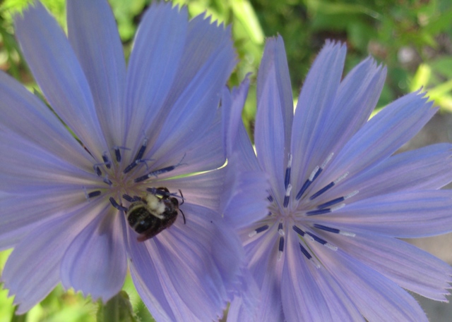 Ah, summer Up North. Time to amble along the road, trailing the dogs, taking pictures of the chicory . . . Look – there’s a bee.