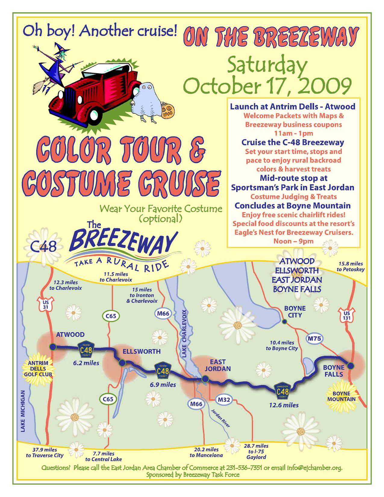 I hope that brilliant fall weather holds until Saturday, because the folks along the Breezeway invite you to a color cruise. Start just up the road in Atwood the Adorable, where you can pick up a packet of coupons and maps at Antrim Dells. Then meander over to Ellsworth where you can shop the farmers market. Drop down into the Jordan Valley to watch the costume judging at Sportsman’s Park or head into town to see the Midener/Beeby exhibit at JRAC. End up in Boyne Falls with a free chairlift ride at the Mountain. Coupons, cute kids in costumes, prime scenery, free stuff, and treats–did I mention there are treats? There are. I don’t see how you can go wrong.