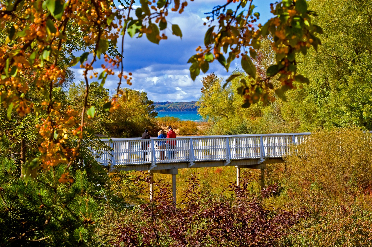This autumn has been a mellow golden one rather than the splashy one we had last year. Babs writes: Fall has come to Northern Michigan. It’s not the most spectacular year for color, but always nice up here. This is the bridge to the library in Elk Rapids looking out to Grand Traverse Bay.