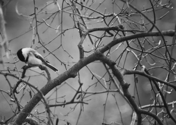 So. Black and white photo. Shades of gray, or grey, take your choice. Very November. But it has a chickadee in it. Chickadees are just about the most appealing little birds in Michigan. They’re bouncy and brash without being obnoxious about it. They never seem to complain. They’re around all year, keeping me company during the snowiest months. They always look tidy.