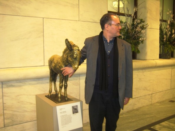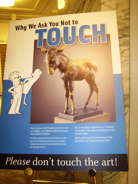 Second, there is my confession to Craig that I always patted the donkey when I visited the DIA, which was very often as Rob the Firefighter was growing up. This marks me as a hopeless Philistine. We decide to create an image for this post. Craig will pat the donkey and I will capture him in the act. OK, he won’t really pat the donkey, as he is not a donkey-patting Philistine, but he will appear to pat the donkey.