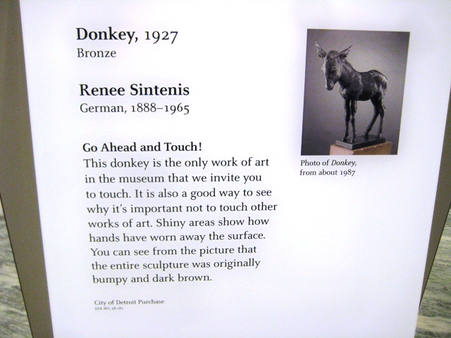 Ah, but David is a painter. Henry Moore probably believed paintings wanted to be touched . . . In any case, I’m positive the donkey wants to be patted. Also the horse outside the Children’s Museum and the sculpture at the entrance to the Dennos Museum in Traverse City.
