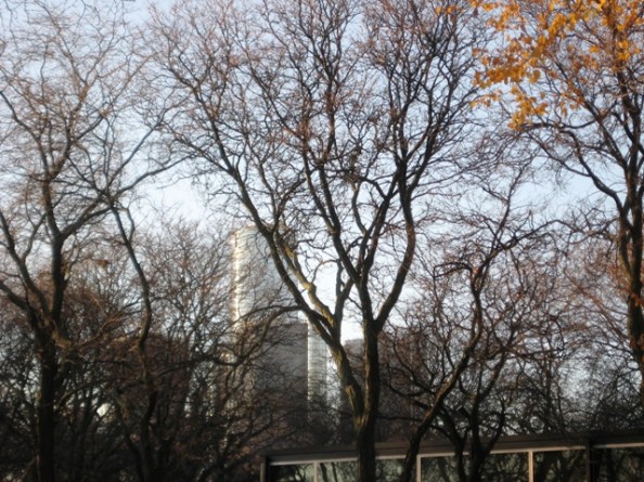 It was a completely satisfactory evening. The whole visit was like that. Autumn is lingering in the city. There’s still a little color here and there, and the lawns are emerald in Lafayette Park. Rob the Firefighter and the Lady Alicia have a seasonal view of the Renaissance Center from their front step.