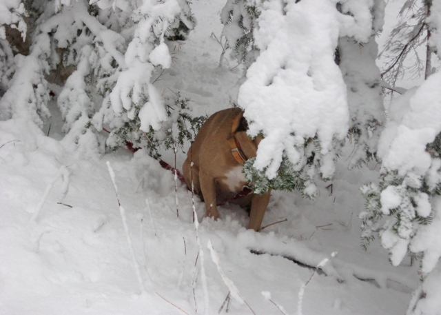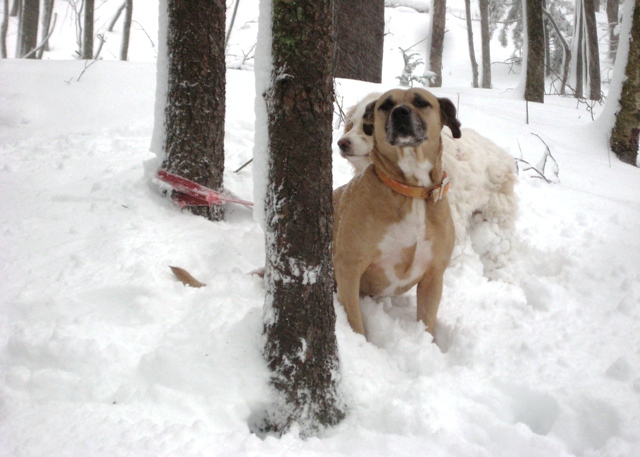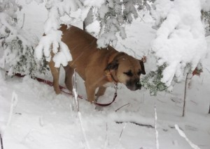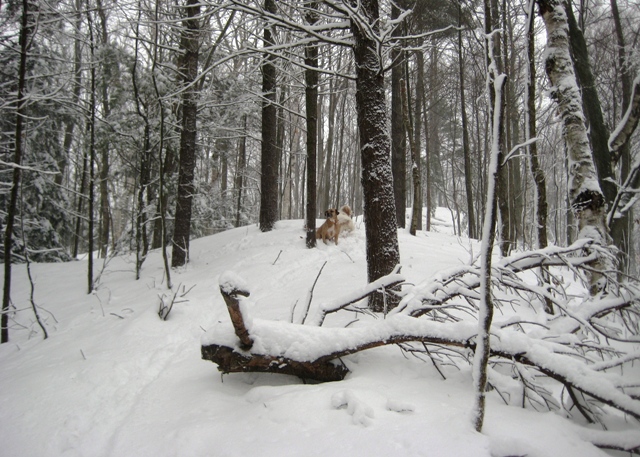 They hared along cross-country to foil pursuit.  I tracked them, climbing uphill puffing and cussing, getting my Record-Eagle wet, grabbing a small tree to haul myself up, shaking all the snow off the tree and down my neck.  Eventually I caught up to them, as they’d wrapped their leash around a tree.