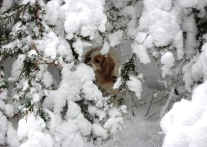 When Miss Sadie and the Cowboy woke me up this morning, the predicted blizzard was here.  We went out to get the paper.  So far, so good: my Record-Eagle was in its bright green holder. Dean Peters must drive a tank. I headed back to the house, assuming that the prospect of breakfast would bring the dogs right along with me.  Ha.  They frolicked.  I trudged.  They hid.  I found.