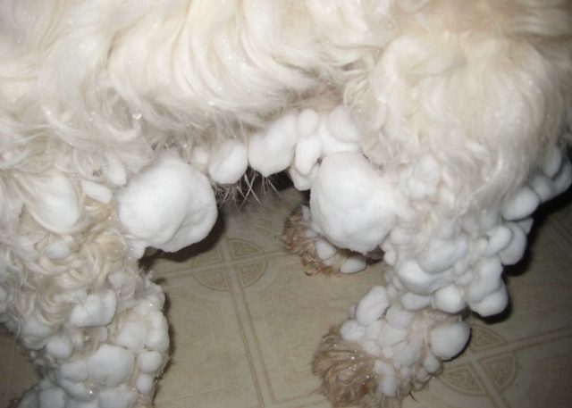 I returned to the Writing Studio and Bait Shop grimly triumphant, dogs in tow.  The Cowboy spent the balance of the morning chewing off his snowball collection.