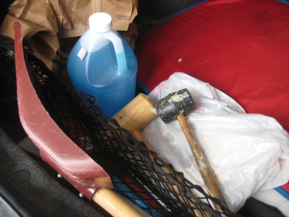 Upon inspection, Eileen’s weapon turned out to be a handy mallet, which she applied smartly to my fenders, rap rap rap. It knocked the slushpiles off without destroying the fenders. So now the well-equipped vehicle includes: blanket, shovel, spare socks and gloves, windshield de-icer, emergency dog crate . . . and mallets. Now you know.