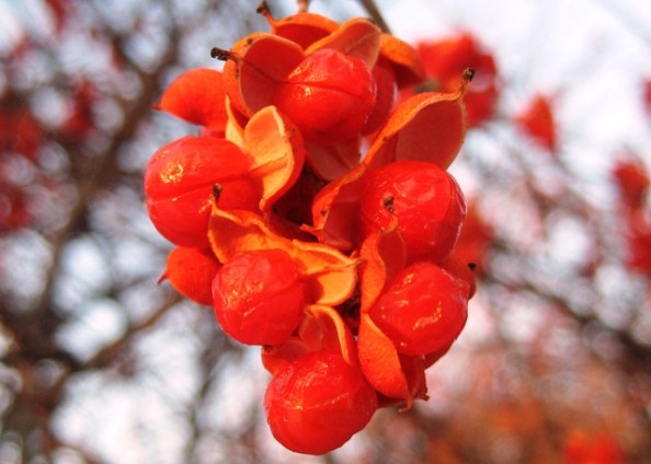 The late afternoon sun set fire to the shrubbery.  I’m pretty sure this is bittersweet, although I would be glad to be corrected.  Susan thinks that if the birds haven’t eaten these pretty berries by now, they must be poisonous.  The berries, not the birds.  I have no idea myself.