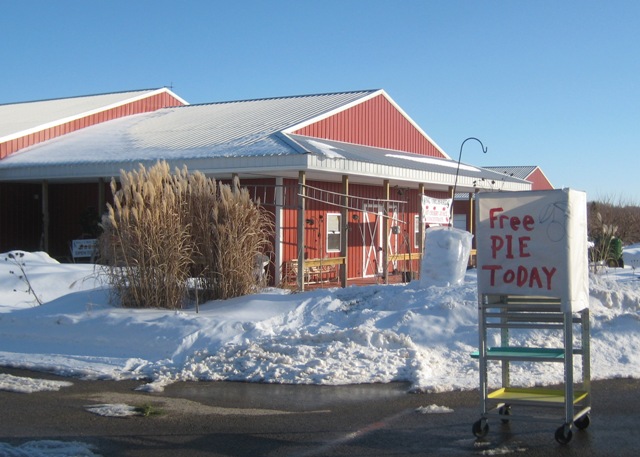 Earlier this week Betsy King issued an invitation to all her friends and neighbors to come by the farm market for a complimentary piece of pie. Then Patty Hill repeated the invitation on the Orchard Talk blog. I figured the place would be mobbed, but it would be worth it. I have had Rose’s pie. Besides, I needed to send off a package or two of excellent treats. It was a beautiful day in the neighborhood, and is there a more beautiful thing than a sign offering Free Pie Today? There is not. I pulled in.