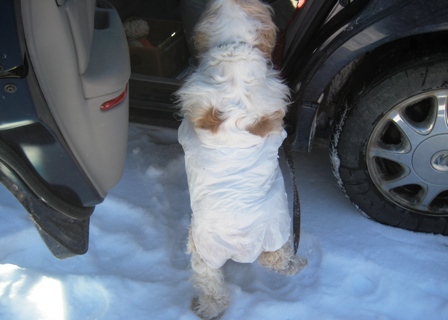 Cowboy in a bag…..hilarious! Did his dignity suffer? If you figure out the grooming business, let me know. It sure would save us some $$$ – 3 out of 4 of our dogs need grooming!