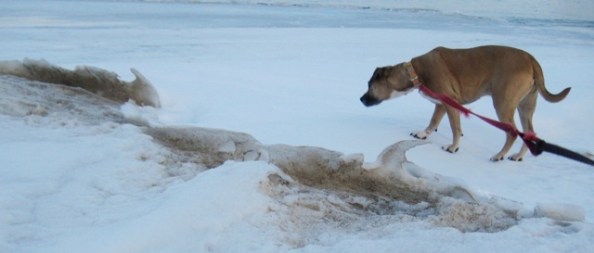 This morning Miss Sadie, the Cowboy and I decided that we were tired of tromping around the same old paths in the snow. After awhile, there is nothing new to see or sniff and that makes us grumpy. Off to the beach then, in the pale dawn, all blue shadows and mist.