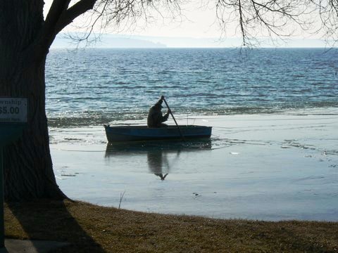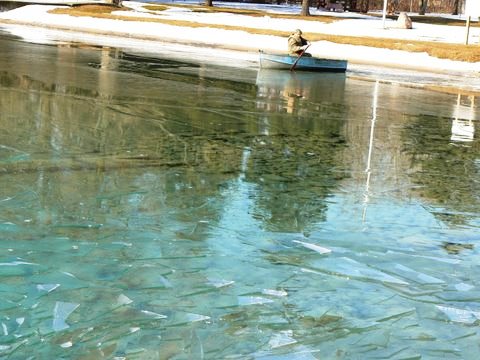She went to get her camera and called Babs Young, who trotted right over with her camera. The two of them had a very, very good time making images of the ice and watching this fisherman. It is not clear to me whether he was determined to be the last one on the ice or the first one in the water, but in any case he hauled his boat out of his truck, dragged it across the grass to the shore, pushed it onto the ice, slapped his oars in the locks, and proceeded to “row” himself across the glassy surface toward open water. Chris, who took these photos, said it took him pretty near 45 minutes to make the trip. I admire persistence.