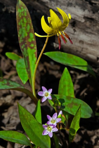 I have my uses. I can report that the little ones are Spring Beauty.  My guide, Stan Tekiela, says that their range is the southern half of the Lower Peninsula, but the Lake Michigan shore creates its own climate, and these little lovelies grow happily in Torch Lake Township, too.
