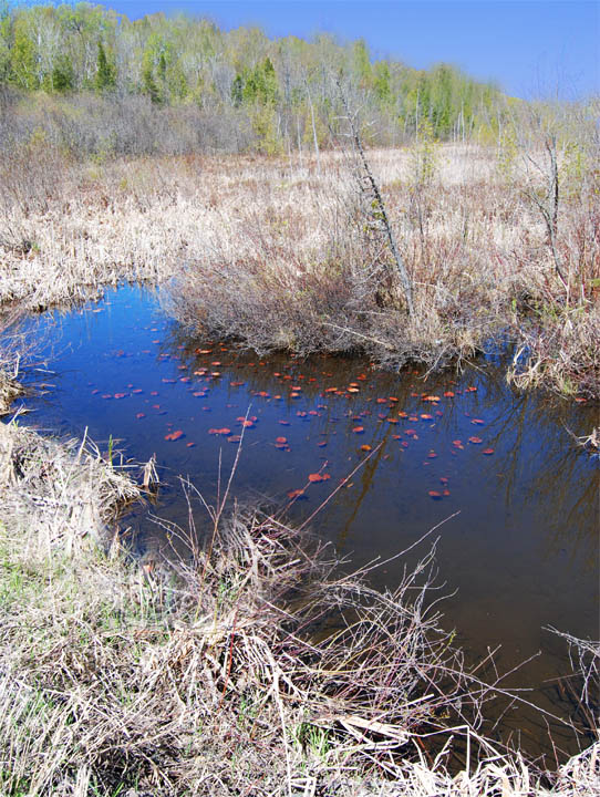 Katherine has been out and about, following her inclinations, which are reliable.  She found a small lake with bronze lily pads floating on it.  She sent us a picture of it, from “somewhere in Charlevoix County.”   The lily pads, she says, might be new this year or left over from last year.  “Have to go back to see if they get bigger,” she says innocently.  “Not quite sure where but I could find it again… only by following my nose.”  Annnnnd I suppose she might spend a little time nosing around in the woods near the lake, especially under the ash trees.  Maybe for just a little minute.