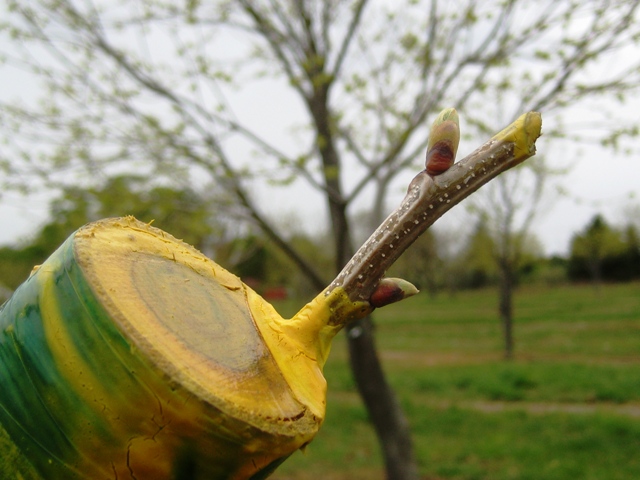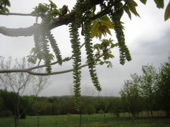 Since it seems determined to s#%@ tonight, I headed over to Farrell Road to inspect Bob Haack’s nut orchard. I’d had an email from Bob saying that the chestnuts were leafing out, and that one of his heartnuts was flowering for the first time.  I wanted to capture it before Mama Nature pitched her hissy-fit. It would be a sort of Historical Document.